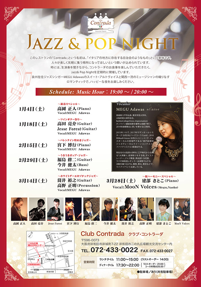 時には、生演奏を聞きながら、コントラーダのお食事を楽しんでいただきたく、Jazz & Pop Night を定期的に開催しています。